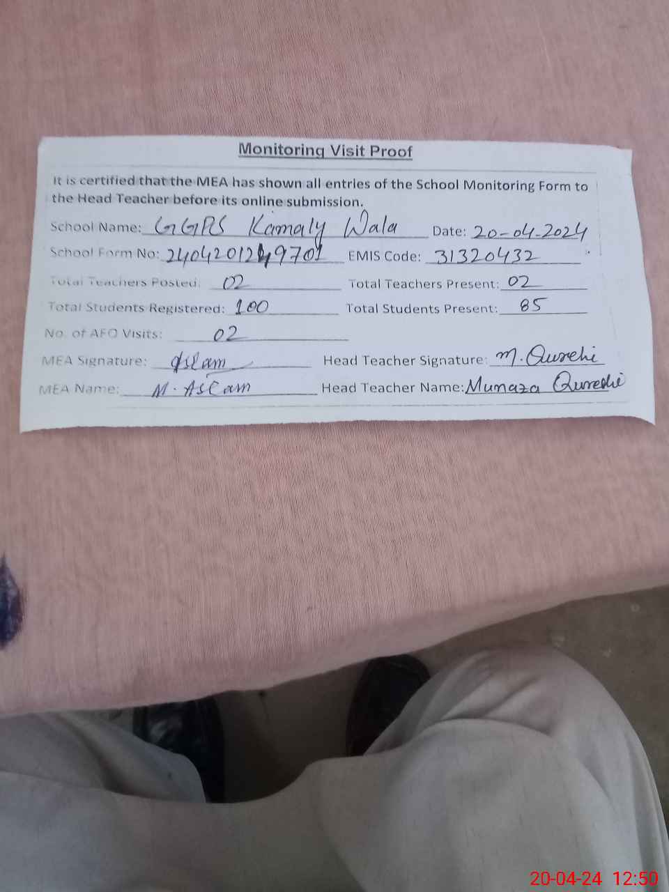 | Attendance Register | Head Teacher | MEA with School | Visit Proof |