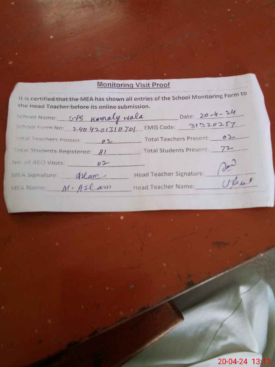| EMIS Code: 31320257 | Name of School: GPS KAMALAY WALA | |||