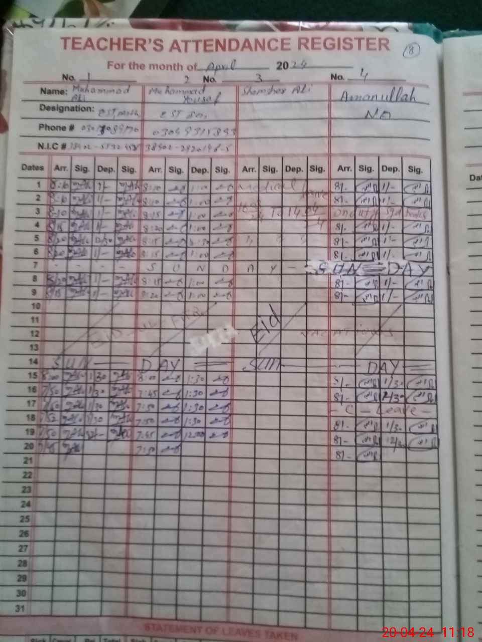 | CNIC | Full Name | Designation | R/C | Absence During Last Calender Month |