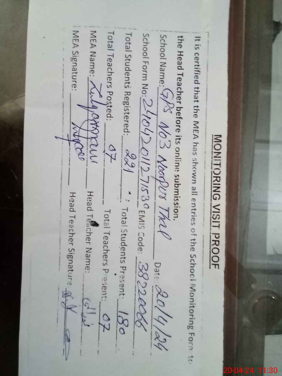 | Attendance Register | Head Teacher | MEA with School | Visit Proof |