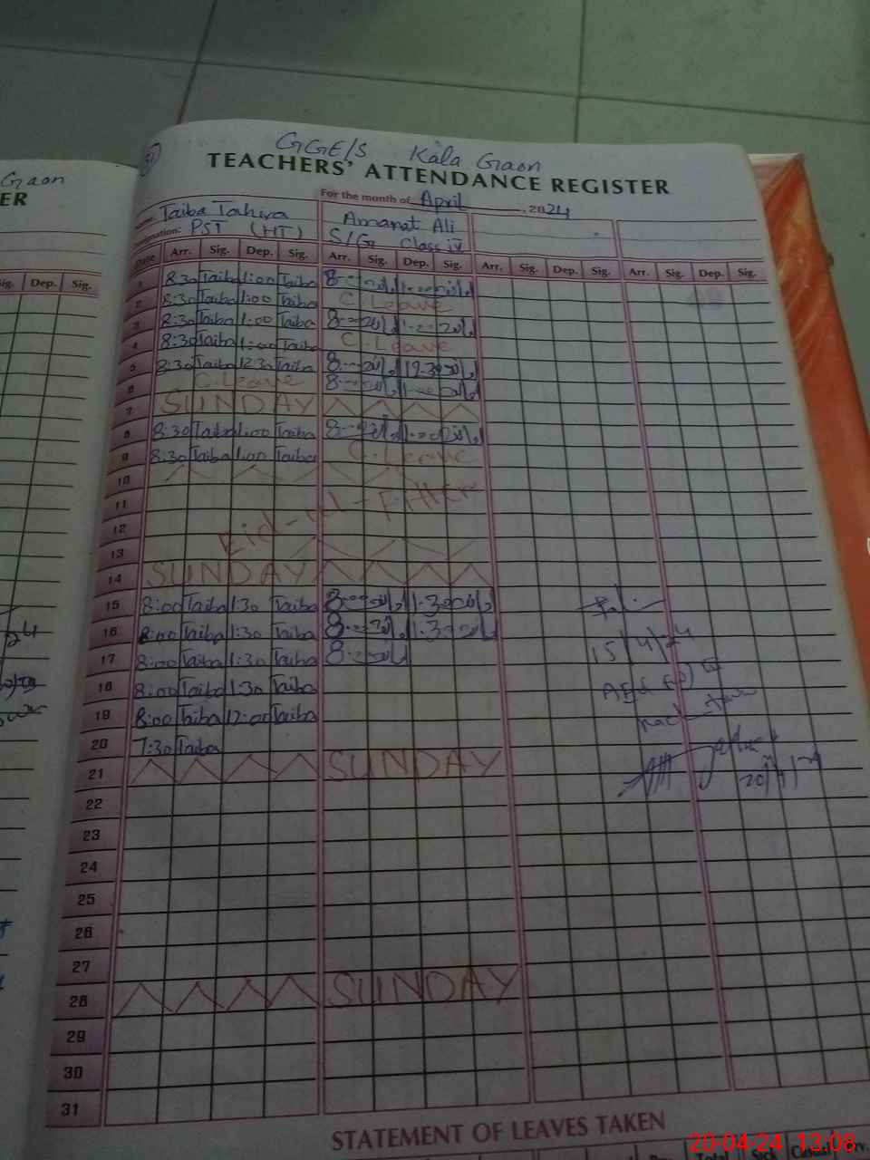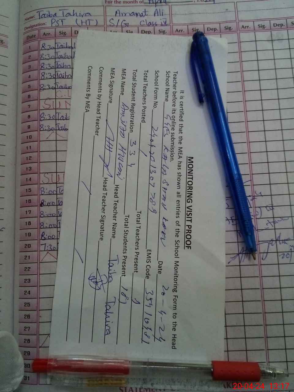 | Attendance Register | Head Teacher | MEA with School | Visit Proof |