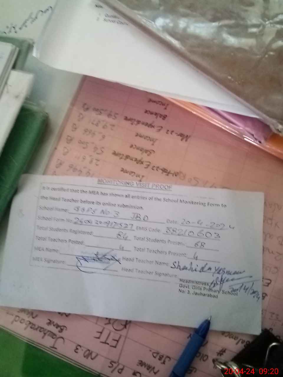 | Attendance Register | Head Teacher | MEA with School | Visit Proof |