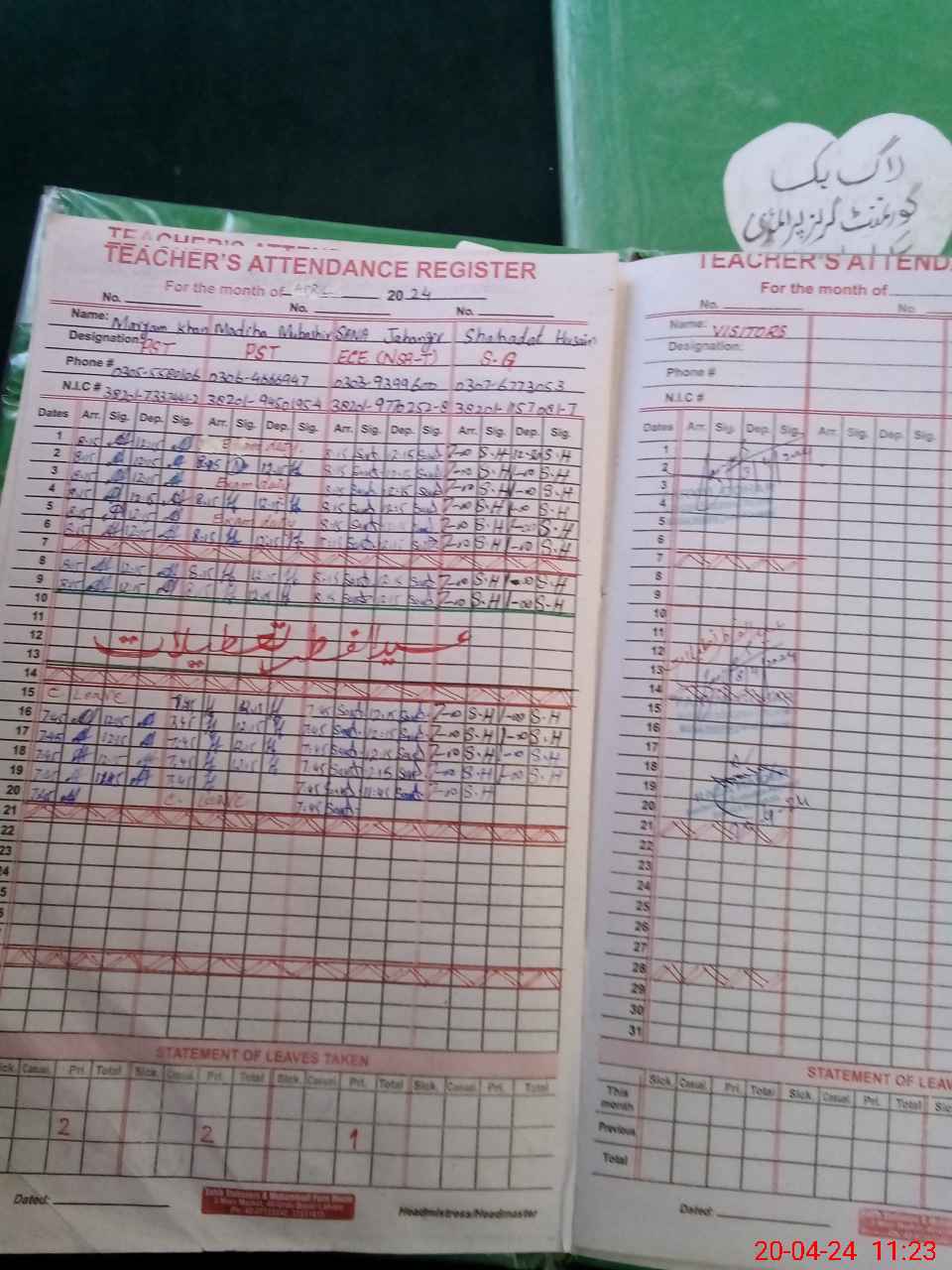 | CNIC | Full Name | Designation | R/C | Absence During Last Calender Month |