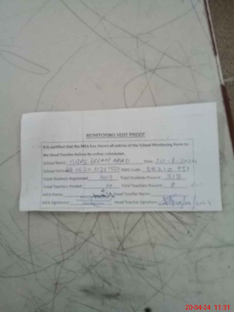 | Attendance Register | Head Teacher | MEA with School | Visit Proof |