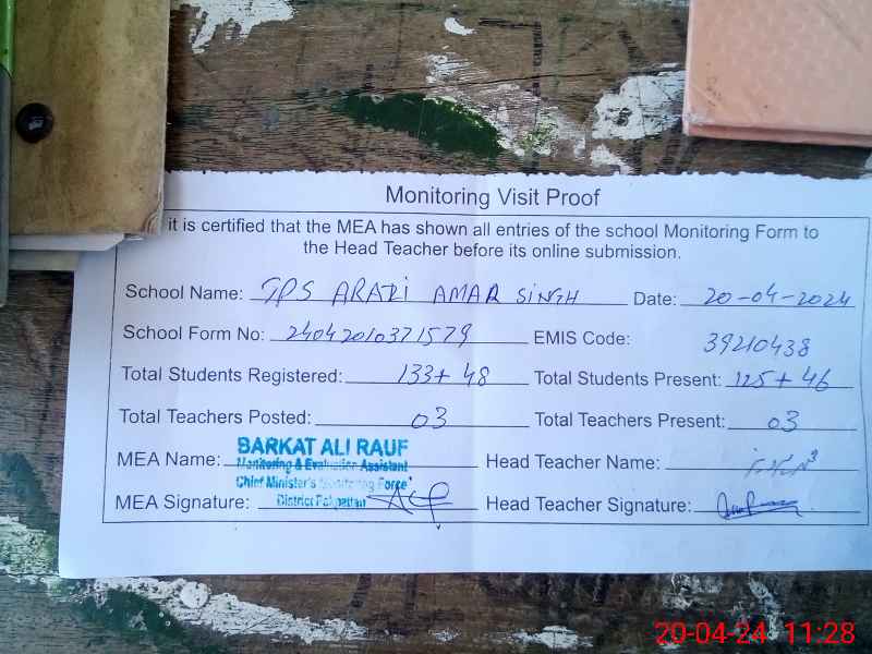 | EMIS Code: 39210438 | Name of School: GPS ARAZI AMAR SINGH | |||