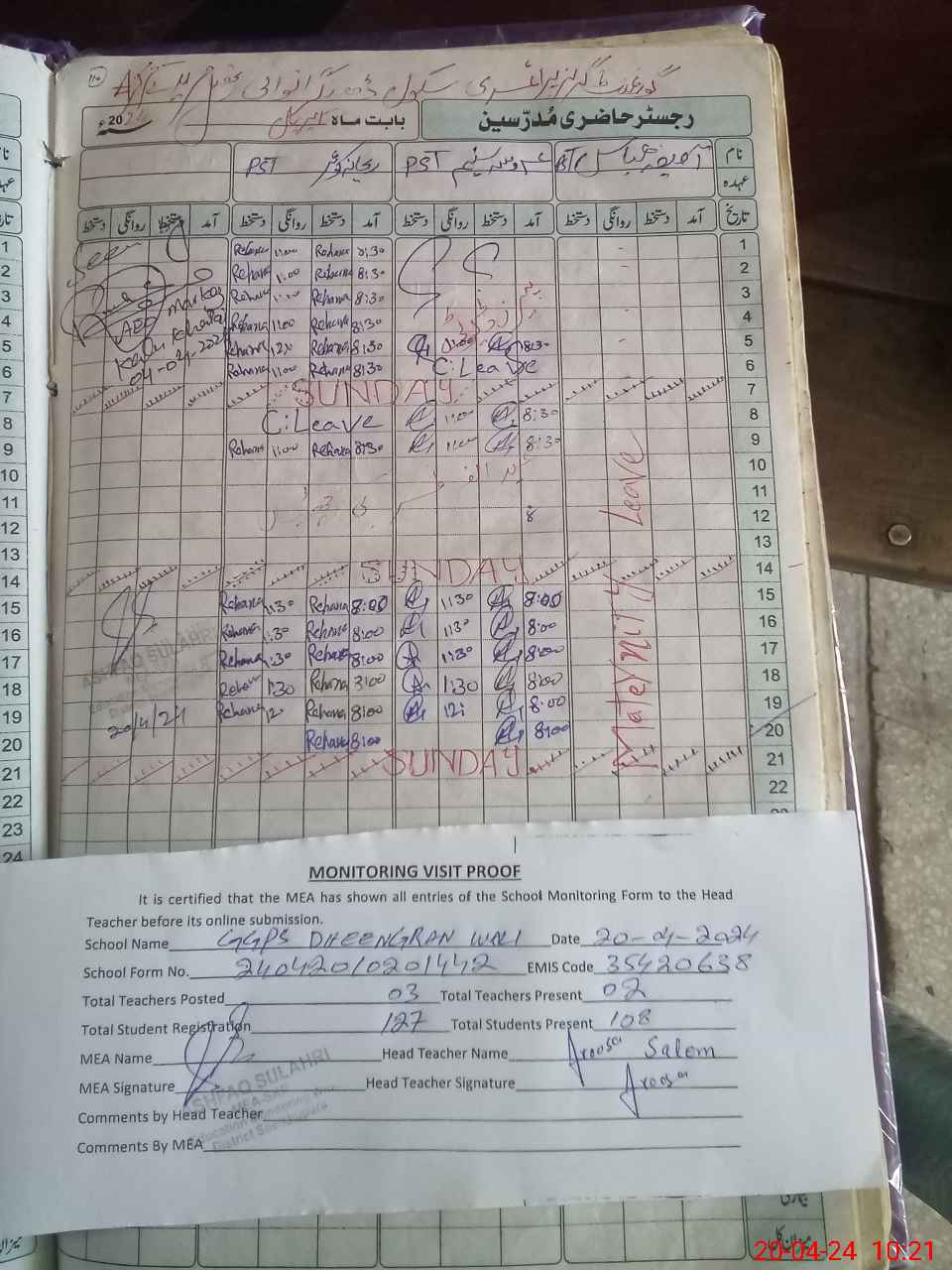 | Attendance Register | Head Teacher | MEA with School | Visit Proof |