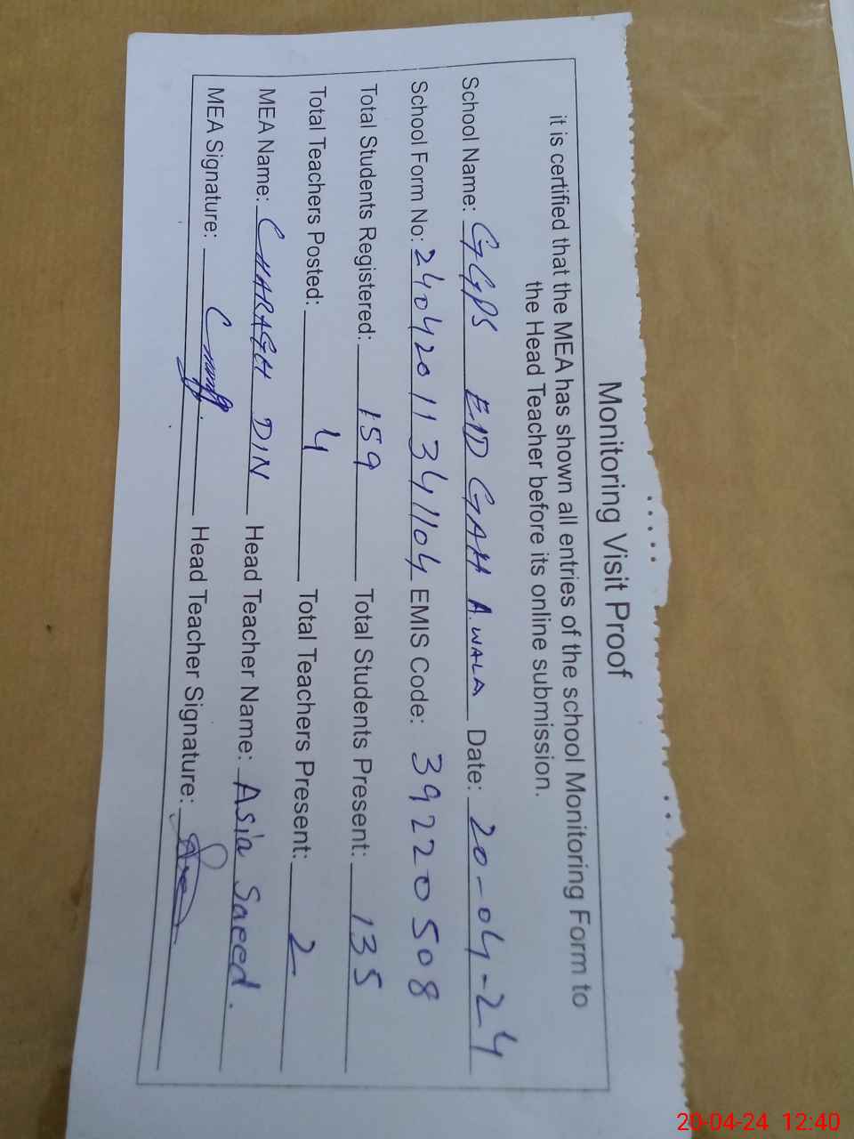 | EMIS Code: 39220508 | Name of School: GGPS EID GAH ARIFWALA | |||