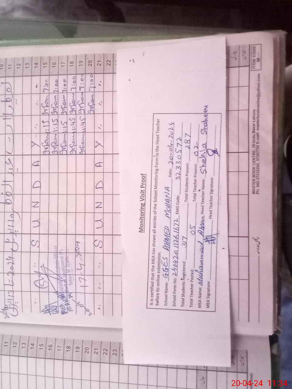 | Attendance Register | Head Teacher | MEA with School | Visit Proof |