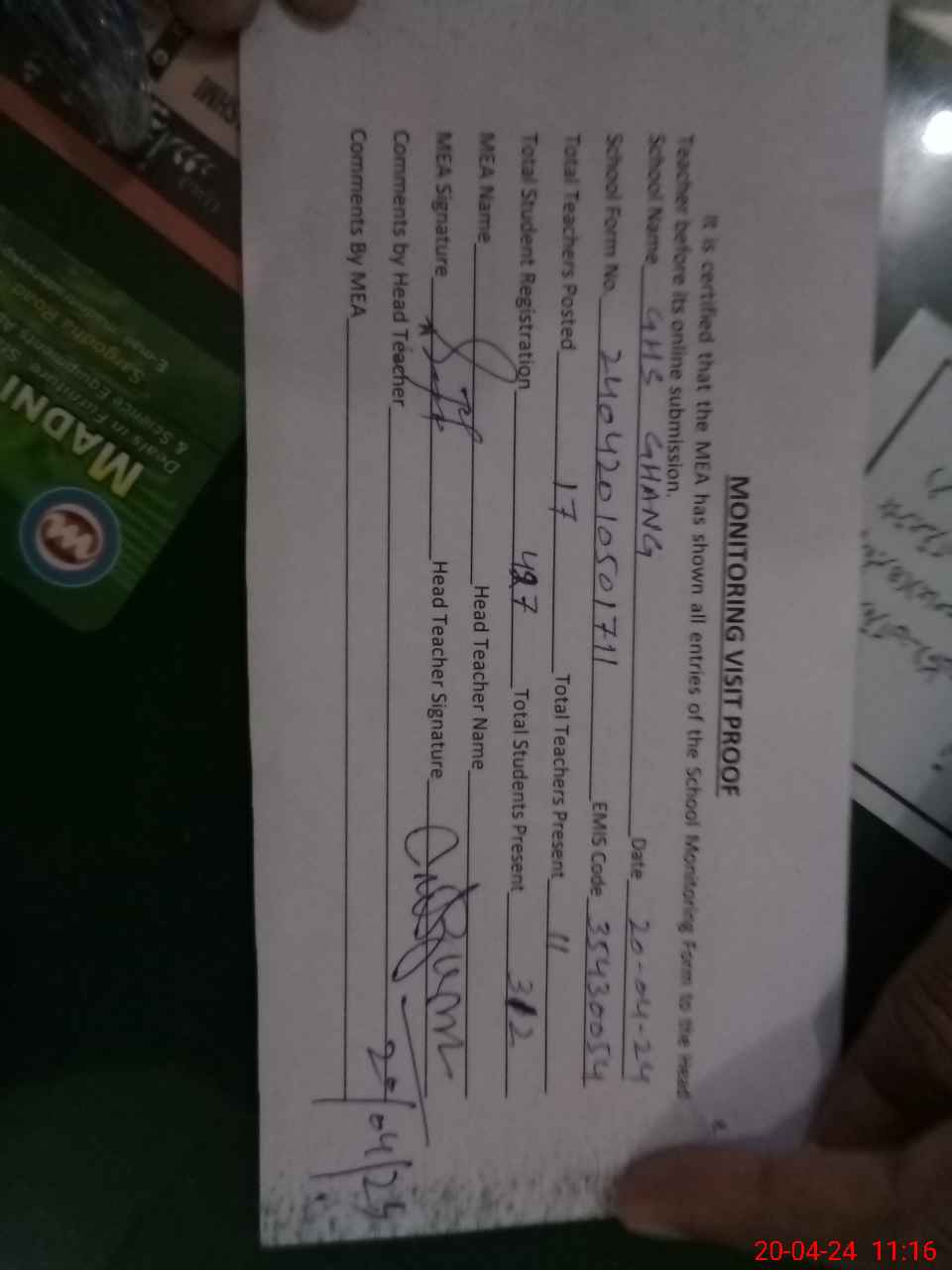 | Attendance Register | Head Teacher | MEA with School | Visit Proof |