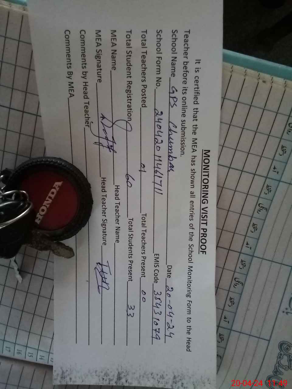 | Attendance Register | Head Teacher | MEA with School | Visit Proof |