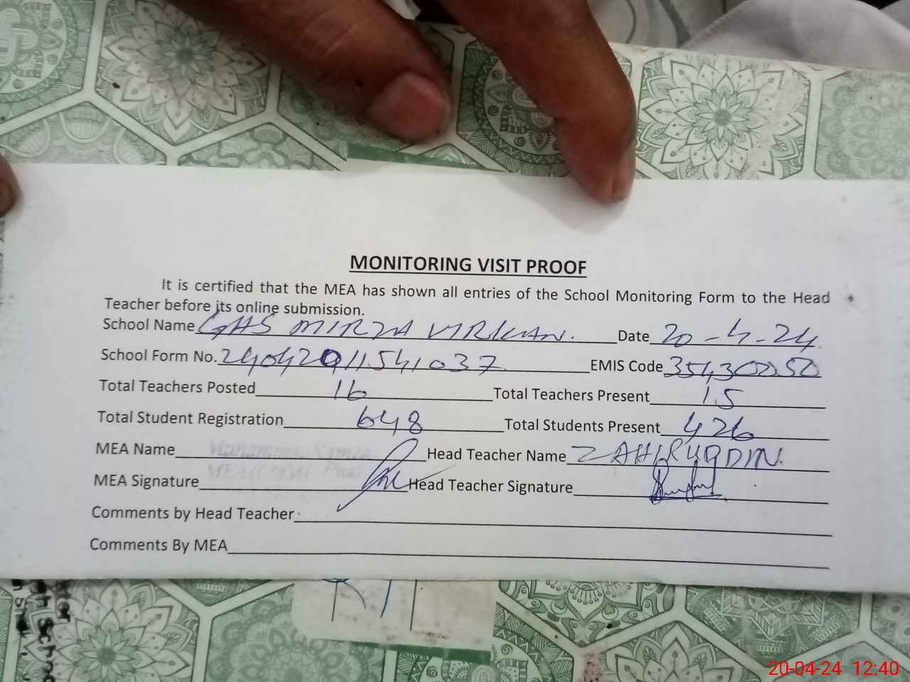 | Attendance Register | Head Teacher | MEA with School | Visit Proof |