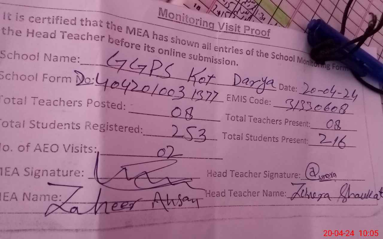 | Monitoring Date: 20-04-2024 | Start Time: 20-04-2024 09:18 AM | End Time: 20-04-2024 10:11 AM | Name of MEA: Za**** Ah**** | |