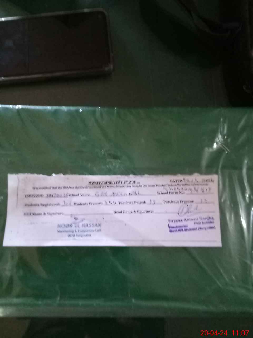 | Attendance Register | Head Teacher | MEA with School | Visit Proof |