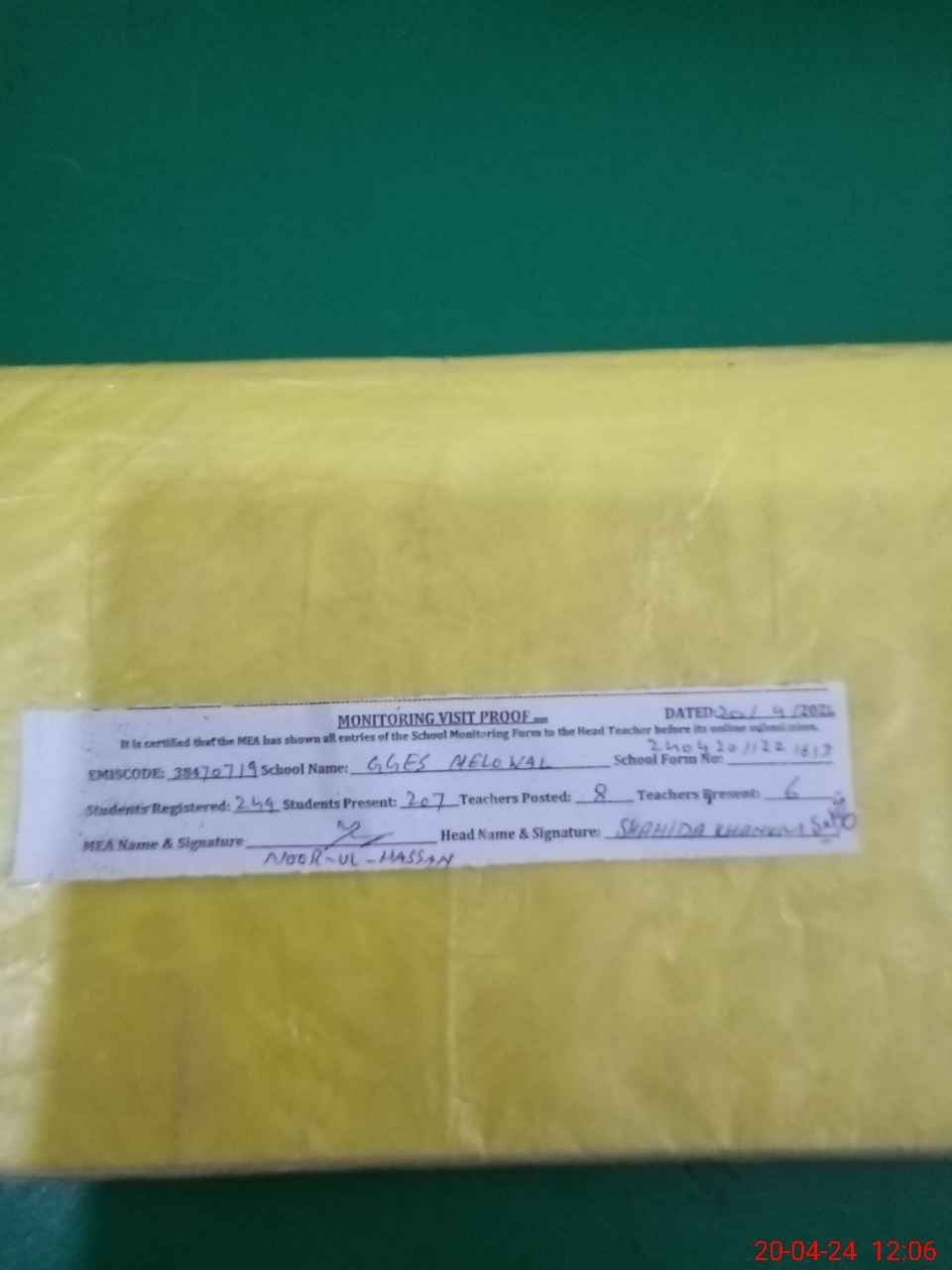 | Attendance Register | Head Teacher | MEA with School | Visit Proof |