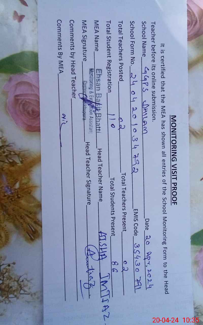 | EMIS Code: 35430791 | Name of School: GGPS DHILAM | |||