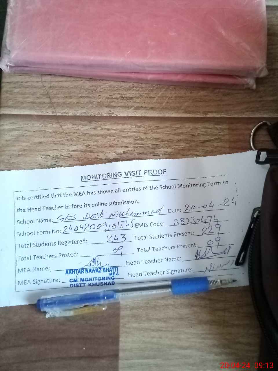 | EMIS Code: 38230474 | Name of School: GES DOST MUHAMMAD CHAK NO. 22 MB | |||