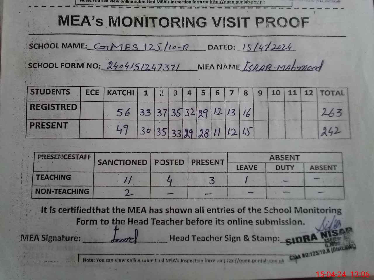 | Certified that this School was Inspected by the Undersigned MEA/DMO Today and the Information Stated Above is as Per Record. | |||||