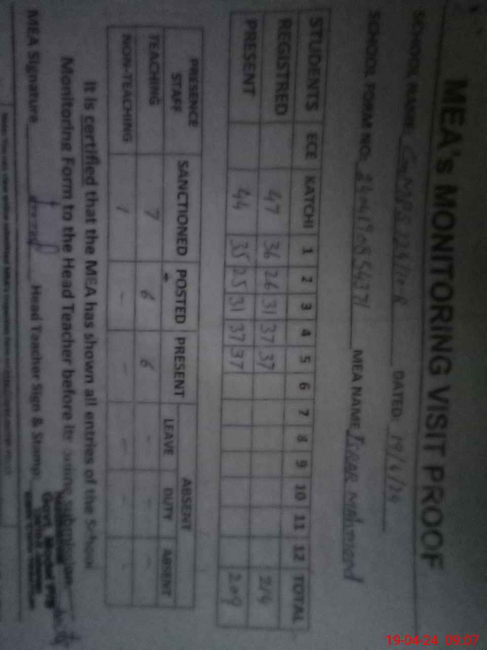 | Attendance Register | Head Teacher | MEA with School | Visit Proof |
