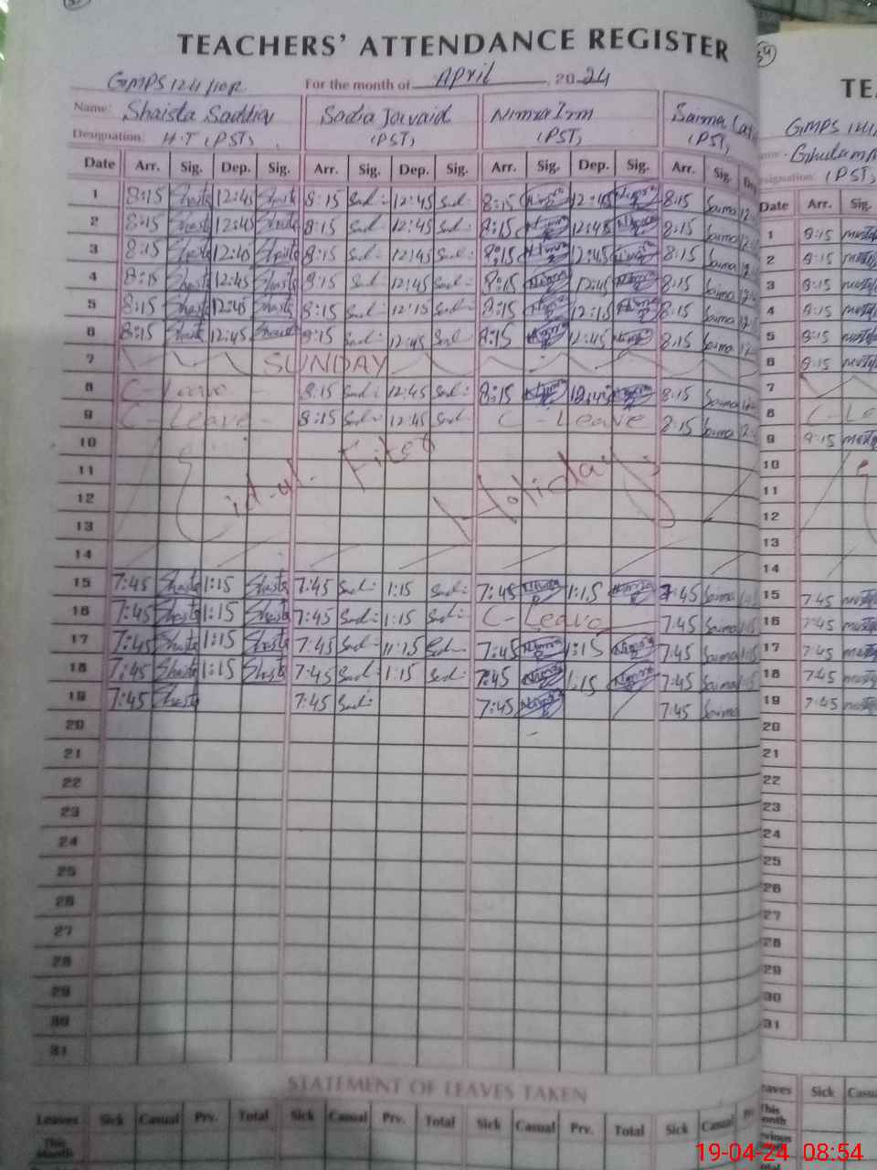 | Leave | Duty | Absent | Maternity | Medical | Ex- Pak |