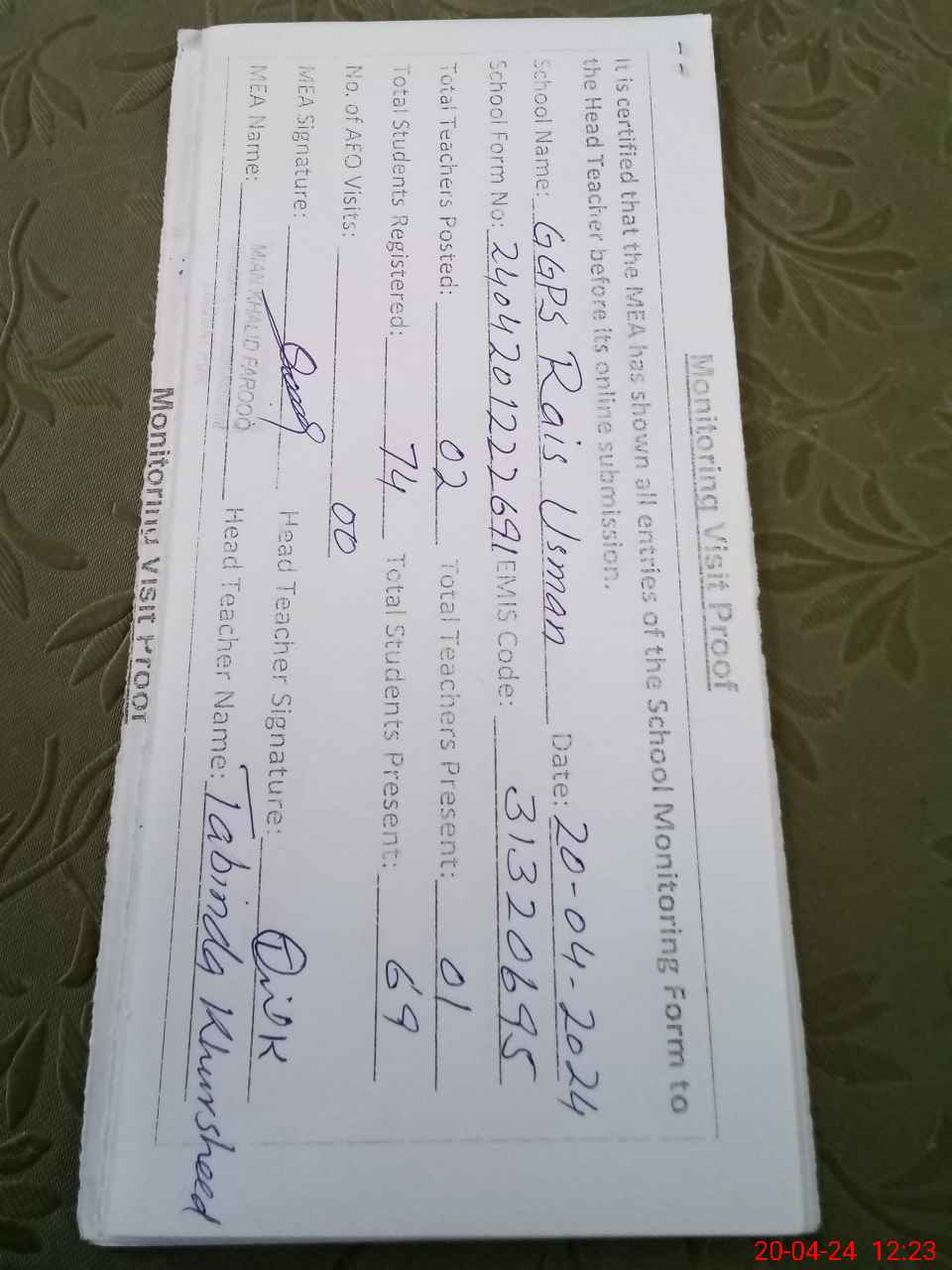 | Attendance Register | Head Teacher | MEA with School | Visit Proof |