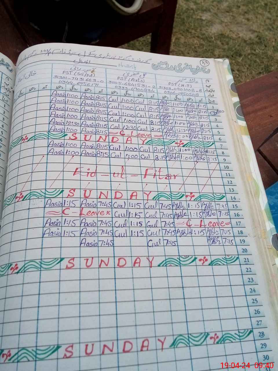 | Leave | Duty | Absent | Maternity | Medical | Ex- Pak |