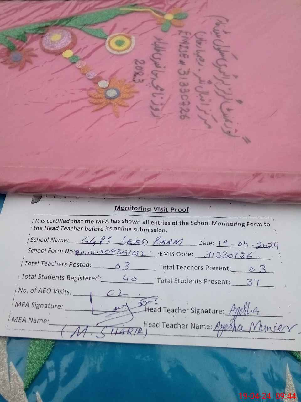 | Attendance Register | Head Teacher | MEA with School | Visit Proof |