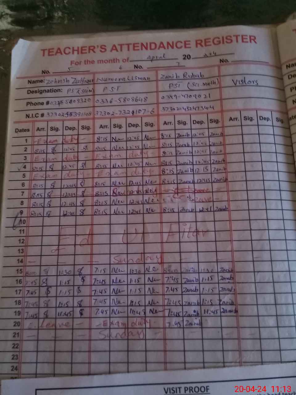 | CNIC | Full Name | Designation | R/C | Absence During Last Calender Month |