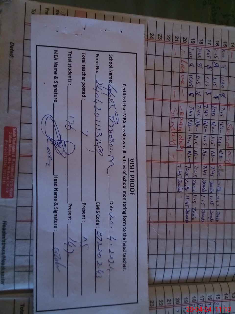| Attendance Register | Head Teacher | MEA with School | Visit Proof |