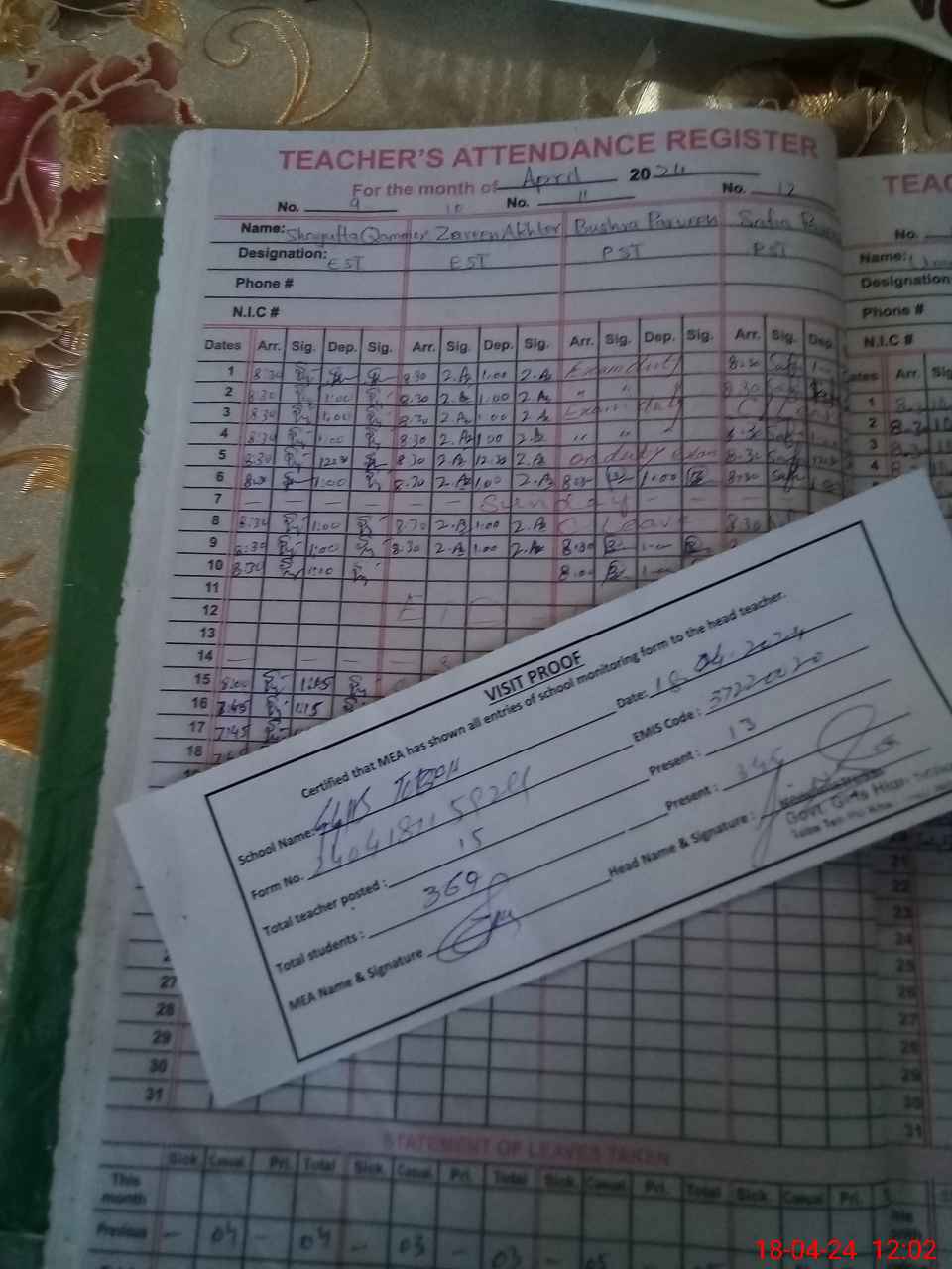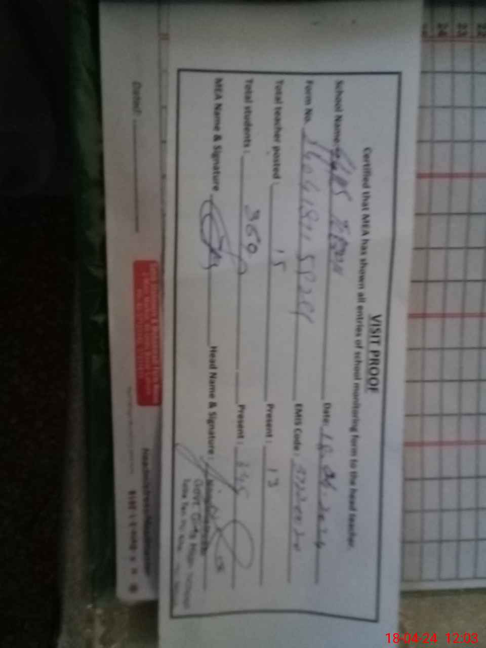 | Attendance Register | Head Teacher | MEA with School | Visit Proof |
