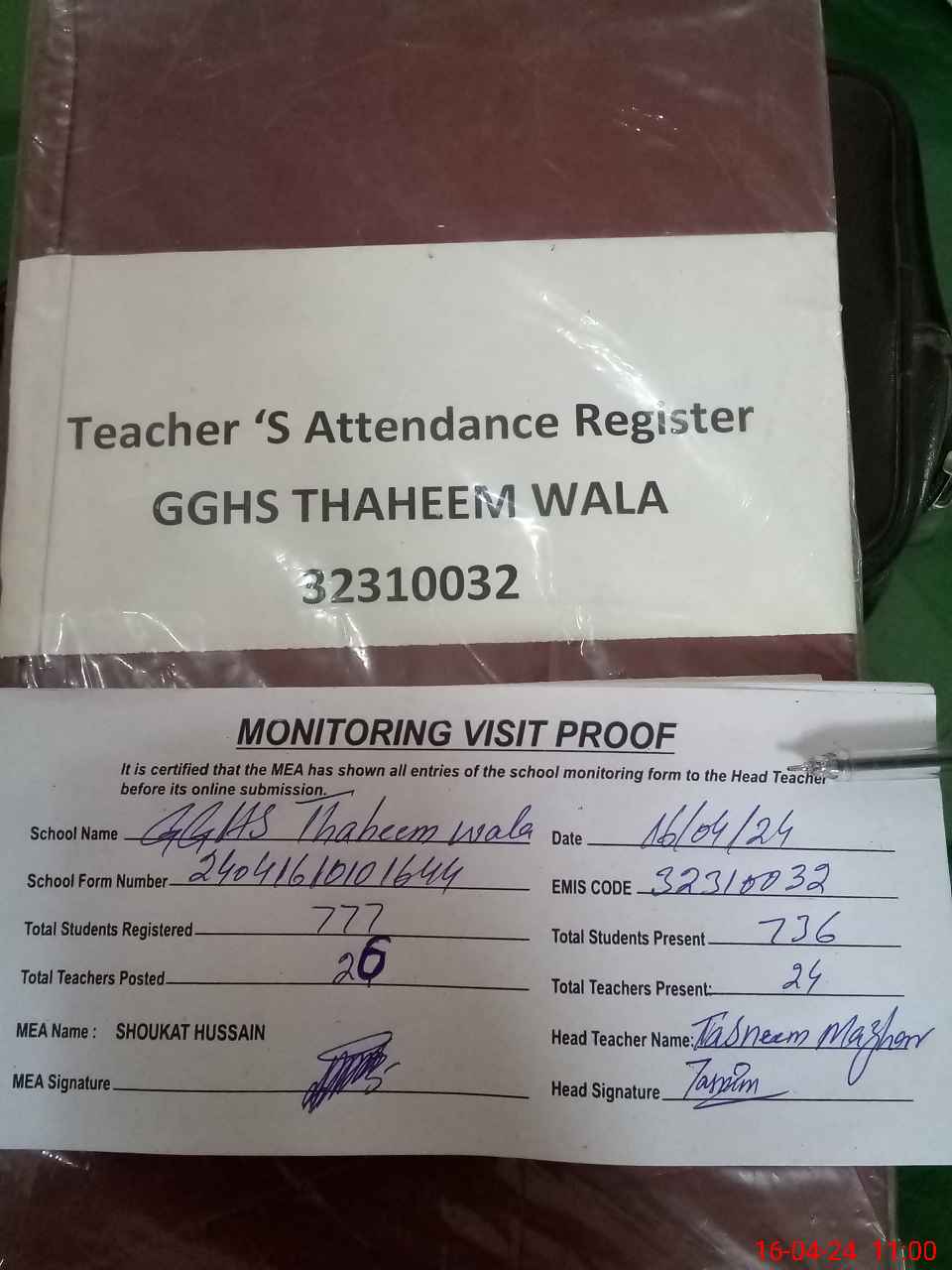 | Attendance Register | Head Teacher | MEA with School | Visit Proof |
