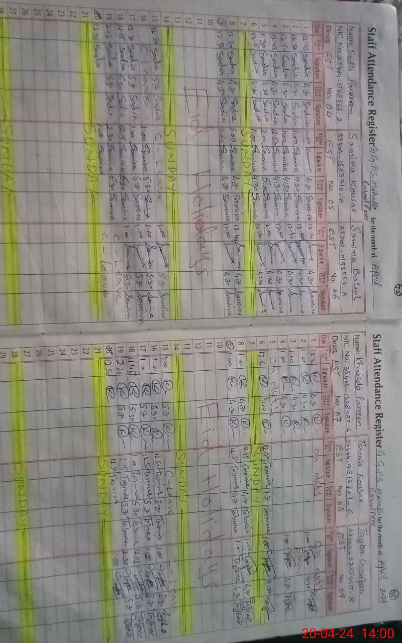 | CNIC | Full Name | Designation | R/C | Absence During Last Calender Month |