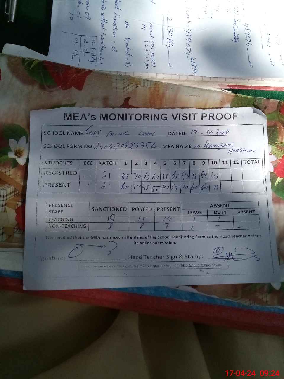 | Attendance Register | Head Teacher | MEA with School | Visit Proof |