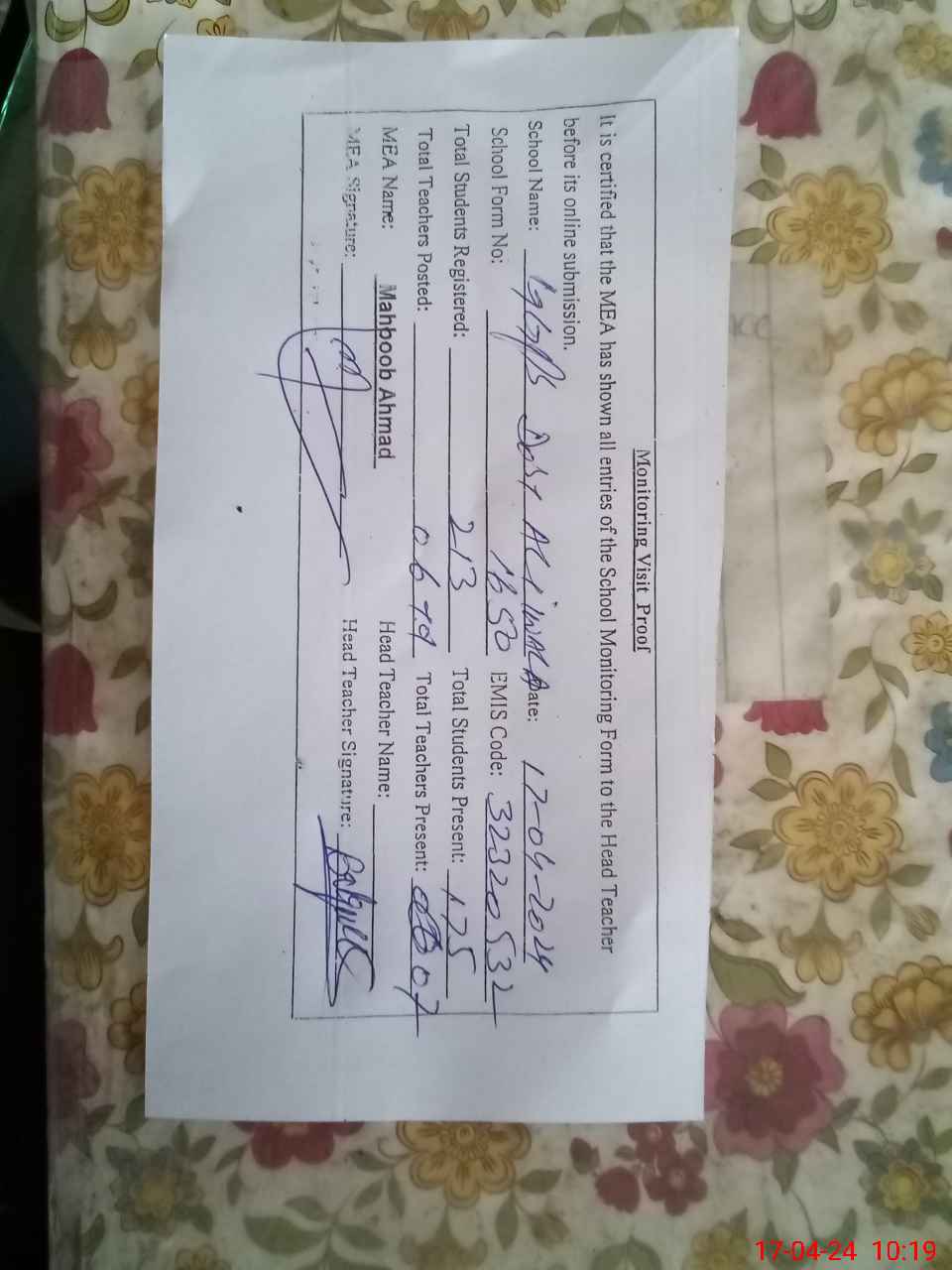 | Certified that this School was Inspected by the Undersigned MEA/DMO Today and the Information Stated Above is as Per Record. | |||||