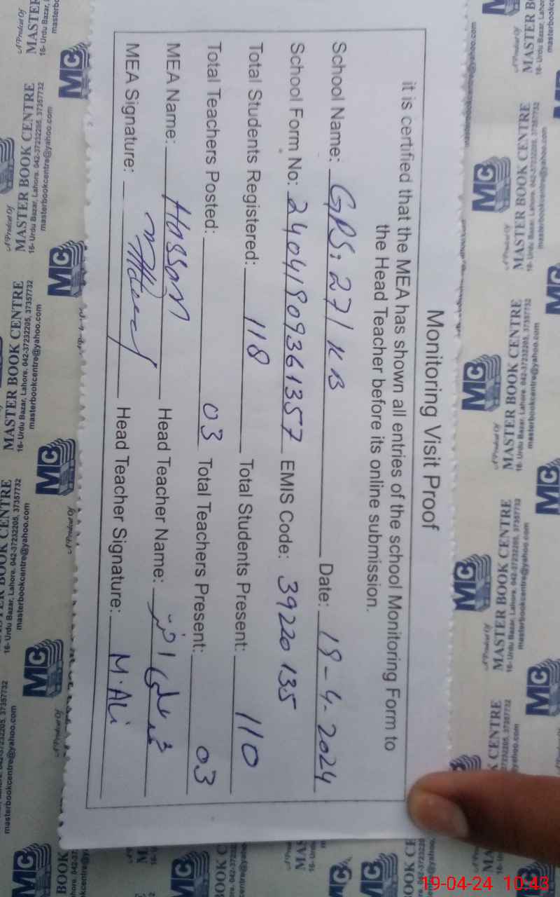 | EMIS Code: 39220135 | Name of School: GPS CHAK NO. 27 KB P.O QABOOLA | |||