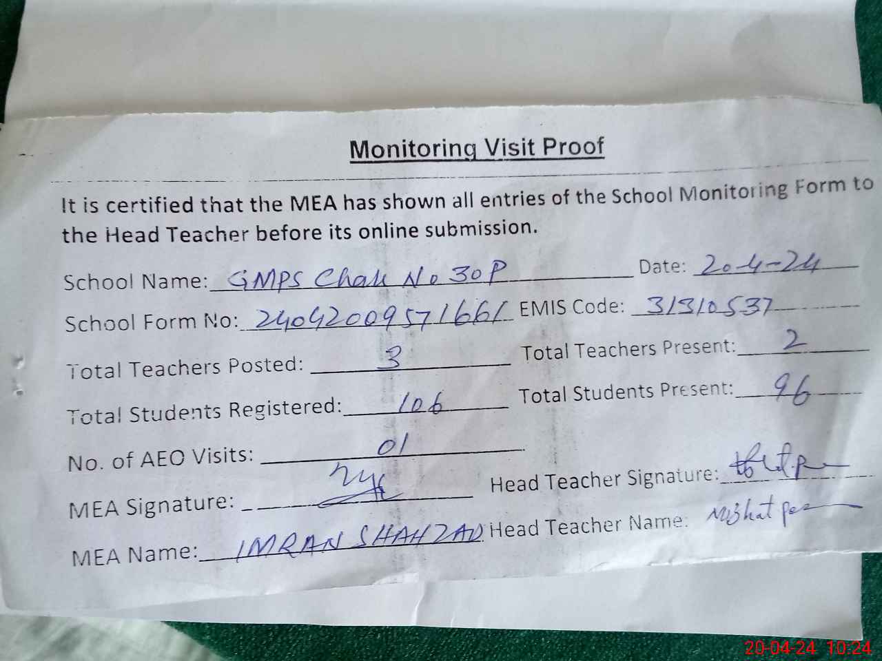 | EMIS Code: 31310537 | Name of School: GMPS CHAK NO 30/P | |||