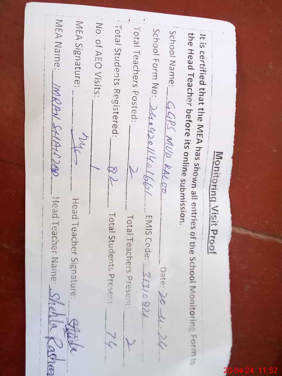 | Attendance Register | Head Teacher | MEA with School | Visit Proof |