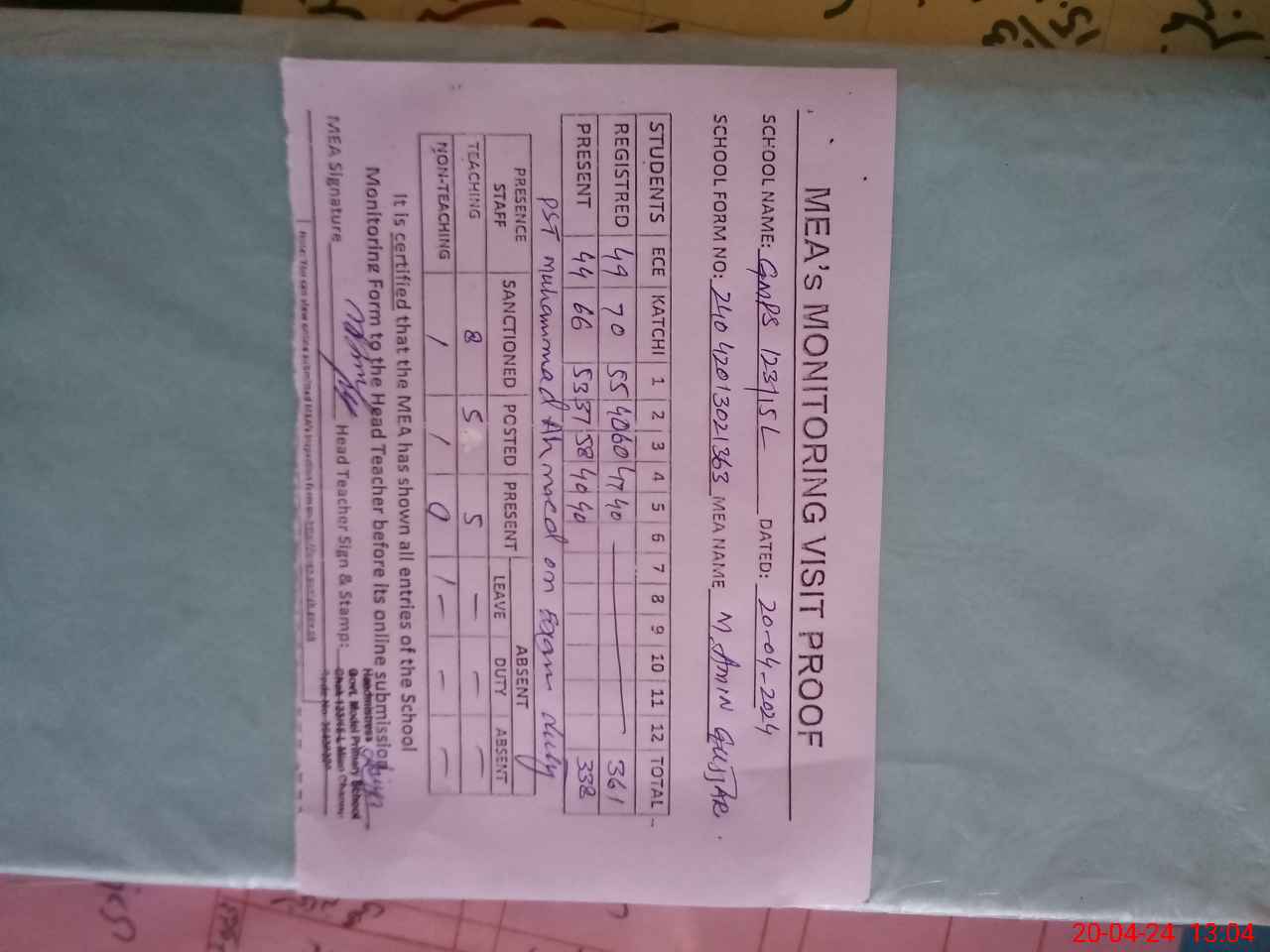 | Attendance Register | Head Teacher | MEA with School | Visit Proof |