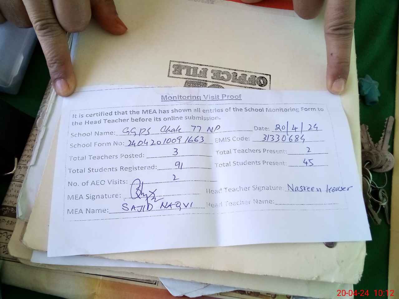 | Attendance Register | Head Teacher | MEA with School | Visit Proof |