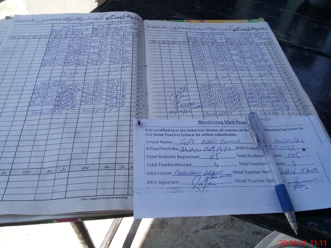 | Attendance Register | Head Teacher | MEA with School | Visit Proof |