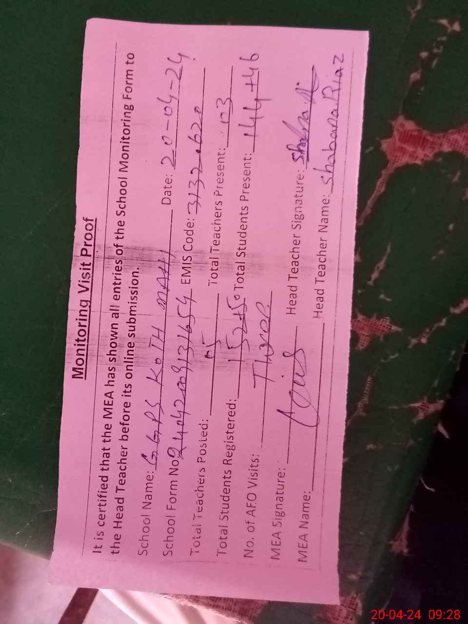 | Attendance Register | Head Teacher | MEA with School | Visit Proof |