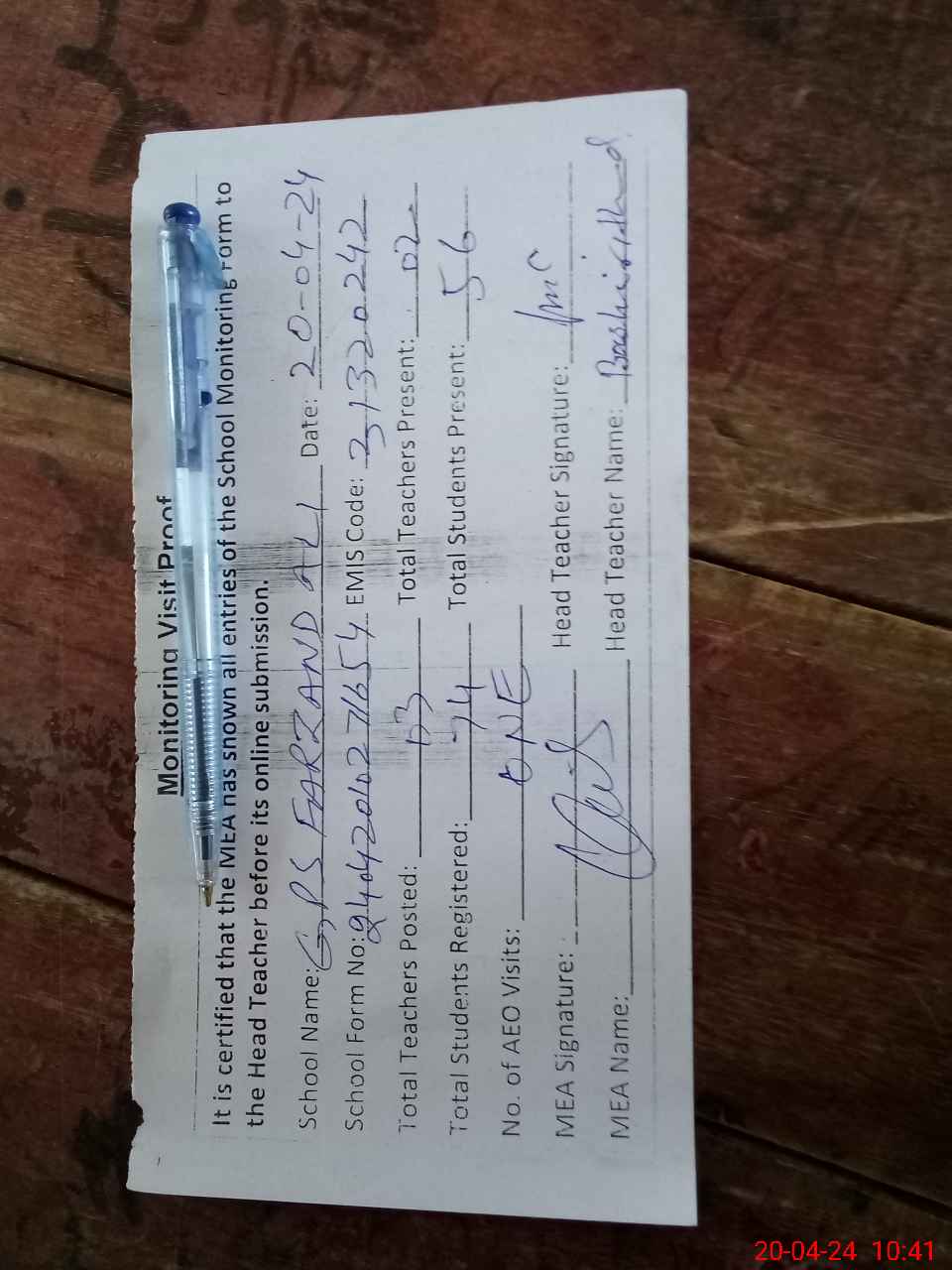 | Attendance Register | Head Teacher | MEA with School | Visit Proof |