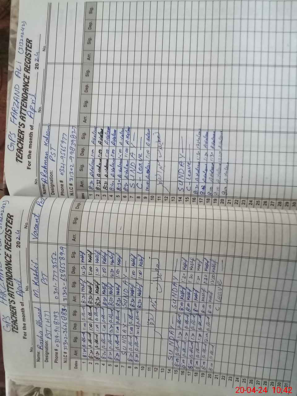 | CNIC | Full Name | Designation | R/C | Absence During Last Calender Month |