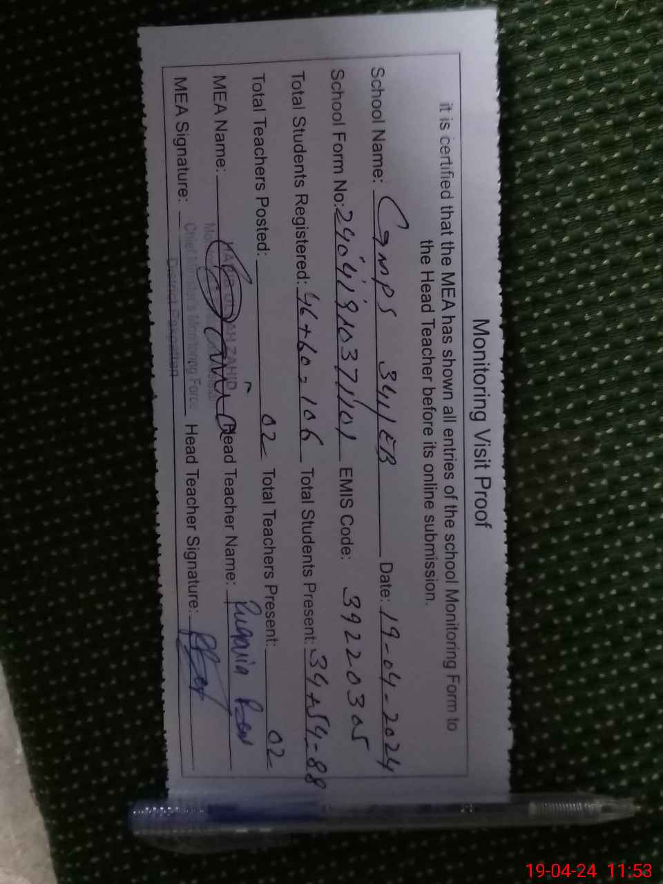| Attendance Register | Head Teacher | MEA with School | Visit Proof |