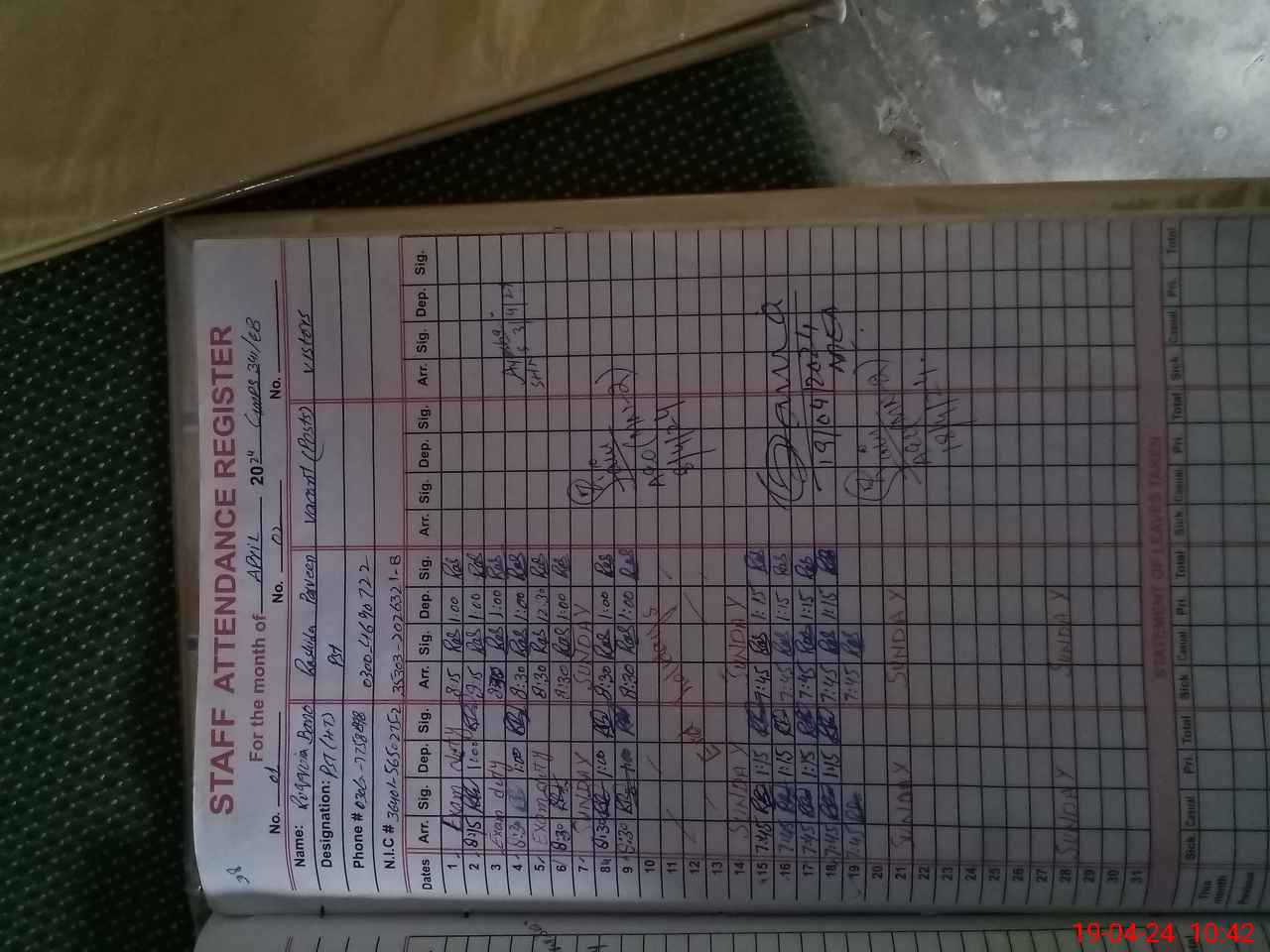 | CNIC | Full Name | Designation | R/C | Absence During Last Calender Month |
