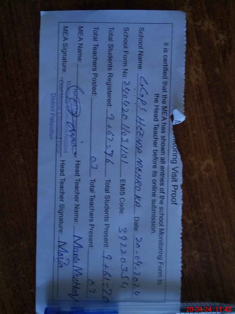 | Attendance Register | Head Teacher | MEA with School | Visit Proof |
