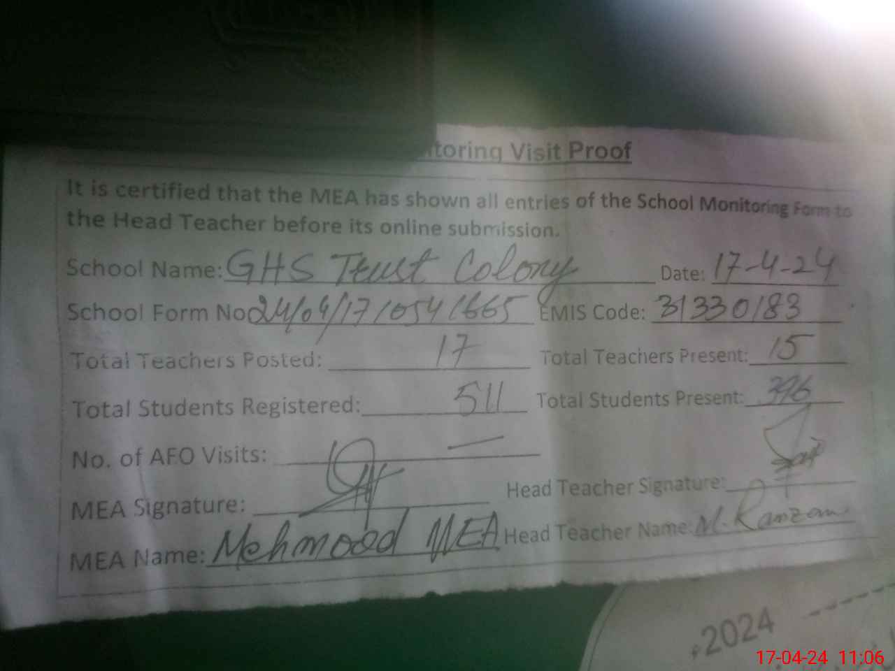 | Attendance Register | Head Teacher | MEA with School | Visit Proof |