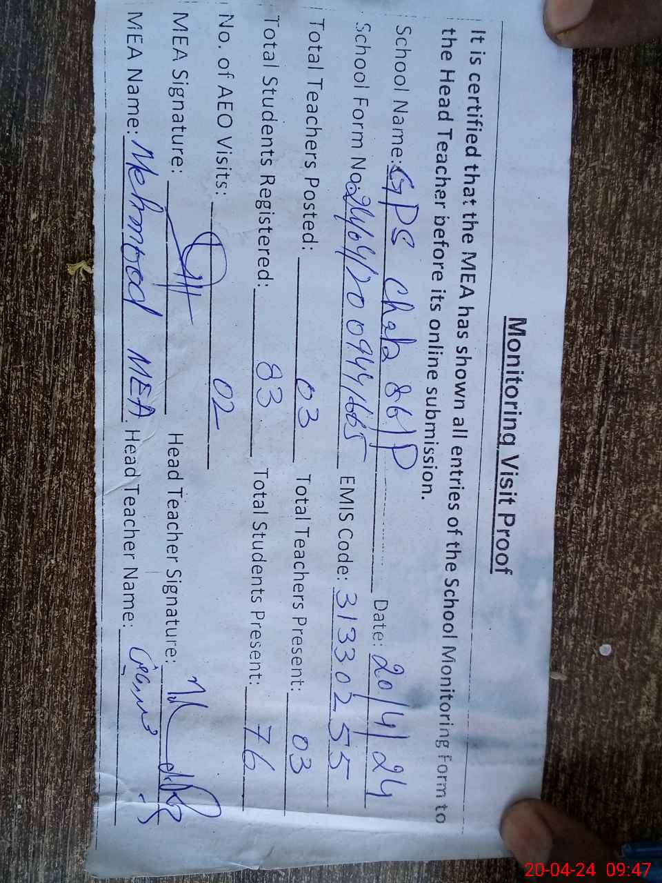| Attendance Register | Head Teacher | MEA with School | Visit Proof |