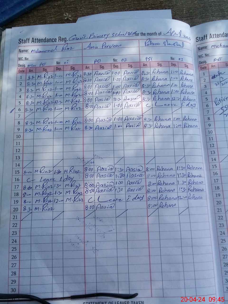 | CNIC | Full Name | Designation | R/C | Absence During Last Calender Month |