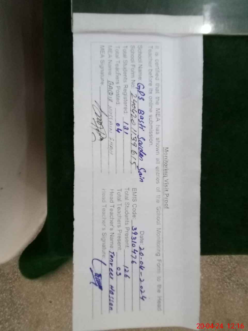 | EMIS Code: 39310476 | Name of School: GPS BASTI SADAN SAIN | |||