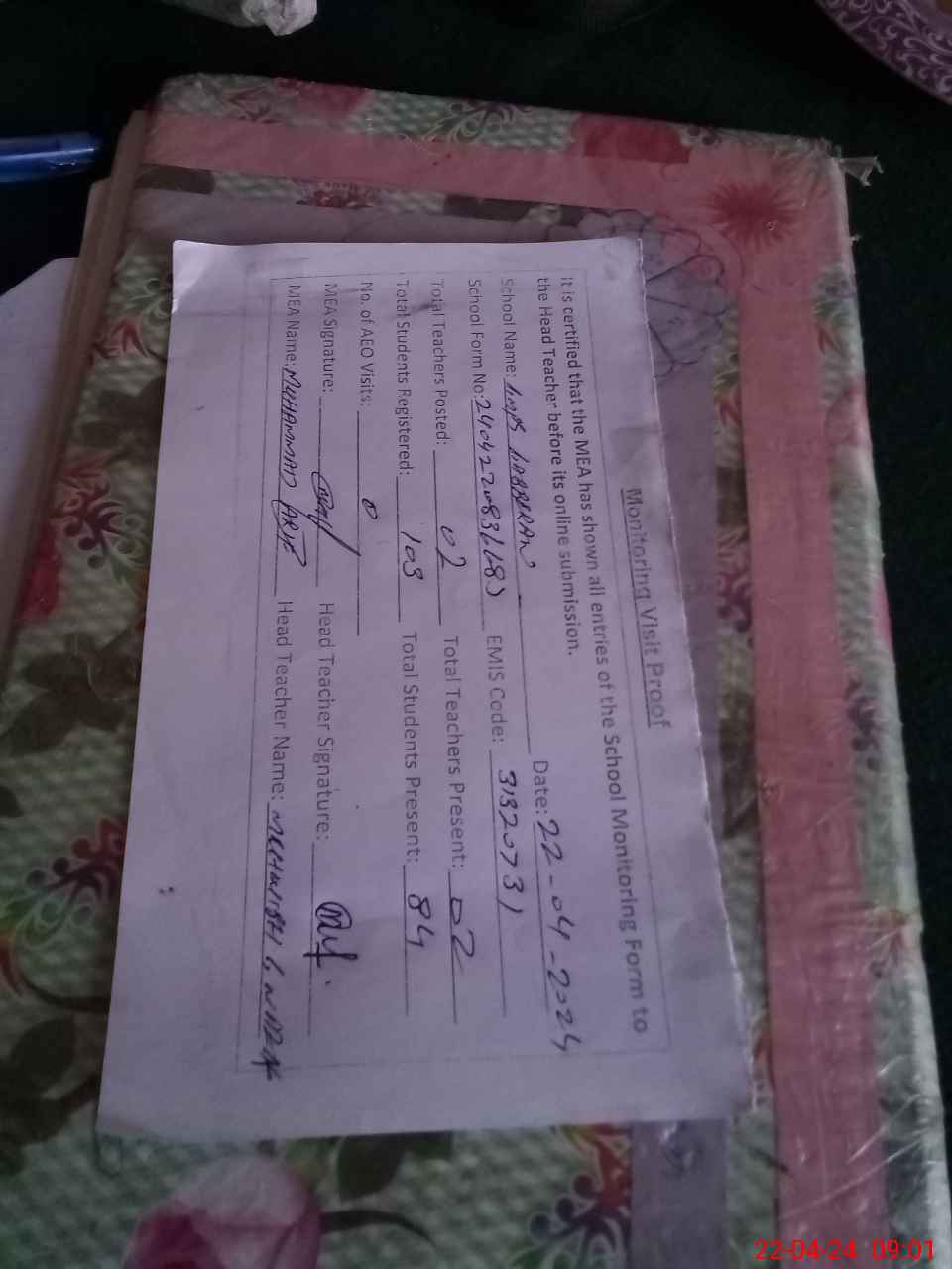 | Certified that this School was Inspected by the Undersigned MEA/DMO Today and the Information Stated Above is as Per Record. | |||||